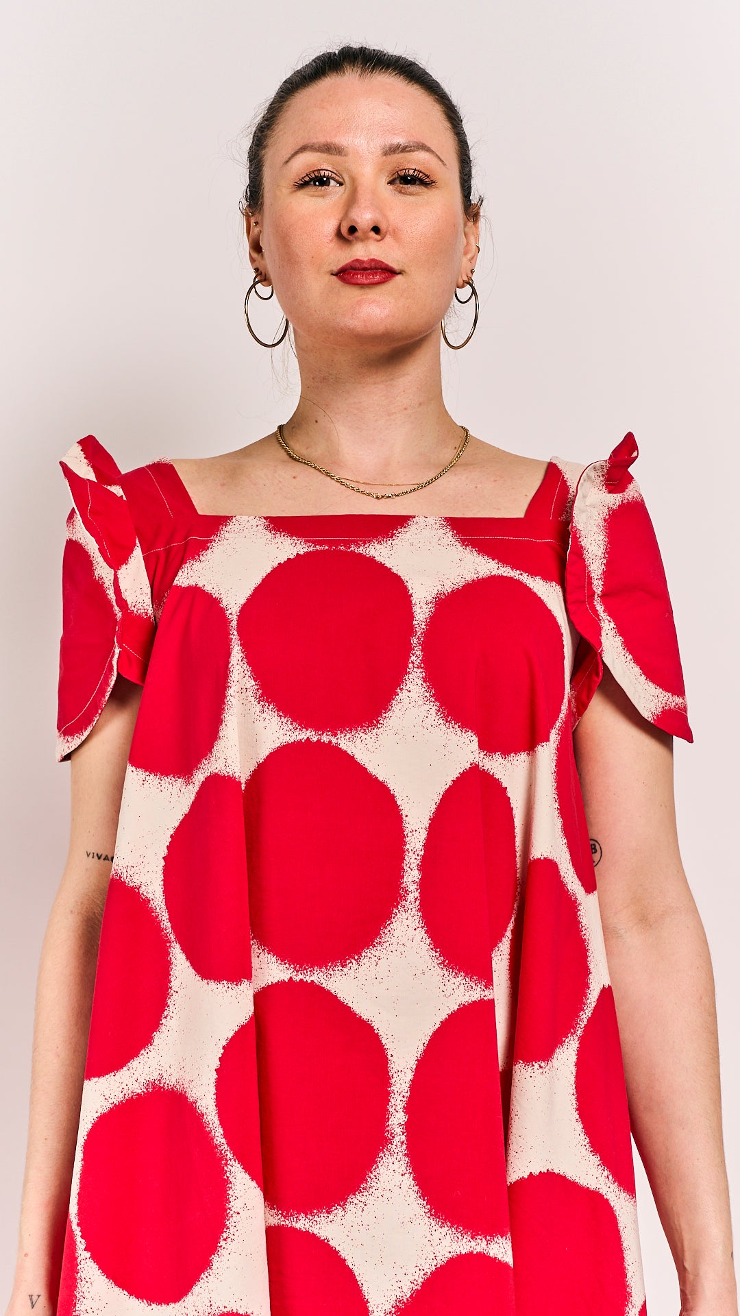 A striking Rundholz Mainline piece that commands attention with its bold round-shape print. The dress features an inventive shoulder design that breaks from convention, creating unexpected visual interest and movement. The ketchup print pattern brings energy and personality to your wardrobe, while the thoughtful construction ensures a refined silhouette. Perfect for those who embrace statement dressing with confidence and flair.