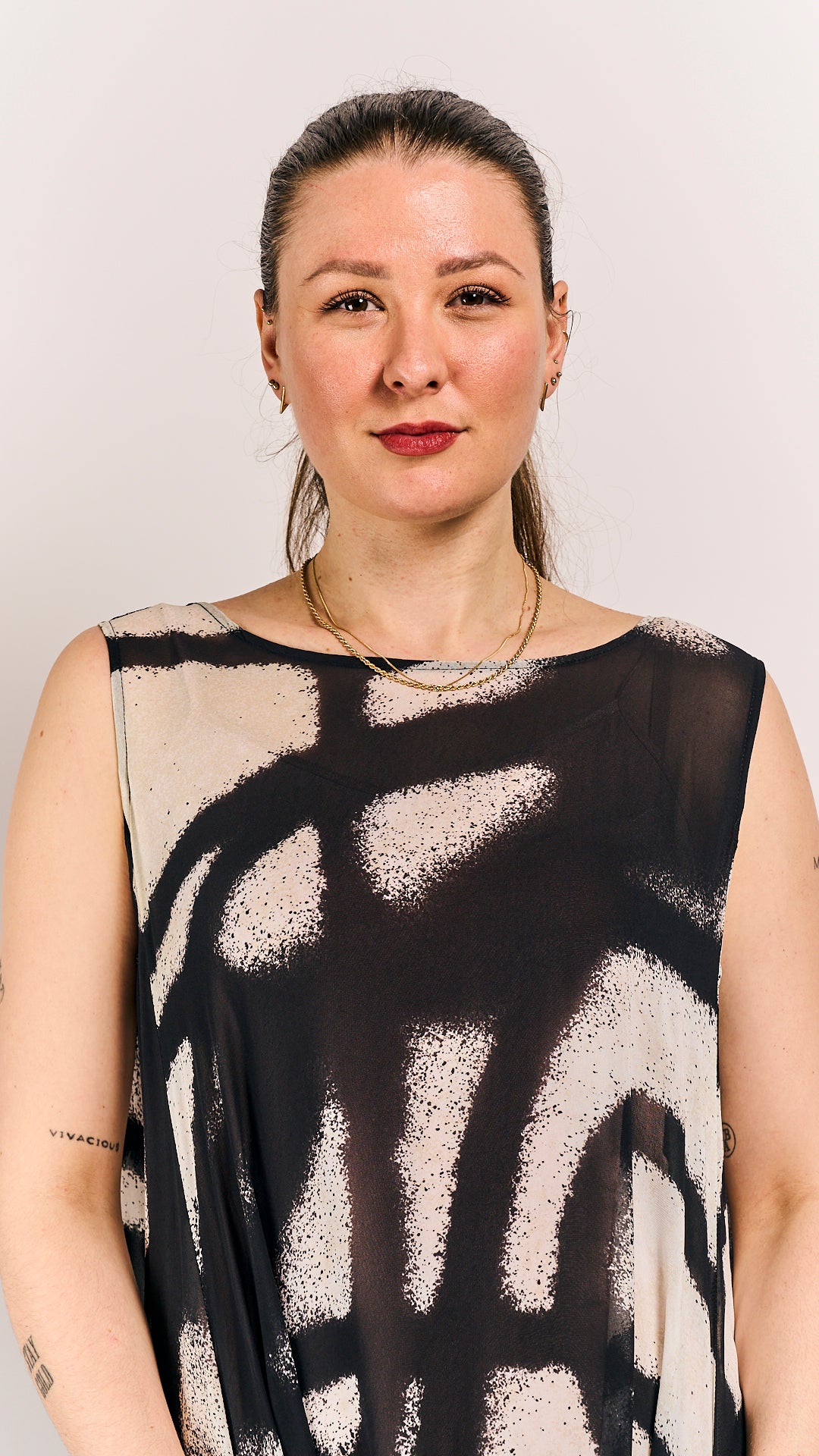 Effortless elegance meets editorial edge with this Rundholz Mainline sleeveless dress. Crafted in a weightless, semi-sheer fabric that moves like a whisper, it features an unexpected black print that brings wit and personality to your wardrobe. The relaxed silhouette drapes beautifully against the body, while the breathable material keeps you cool and comfortable.