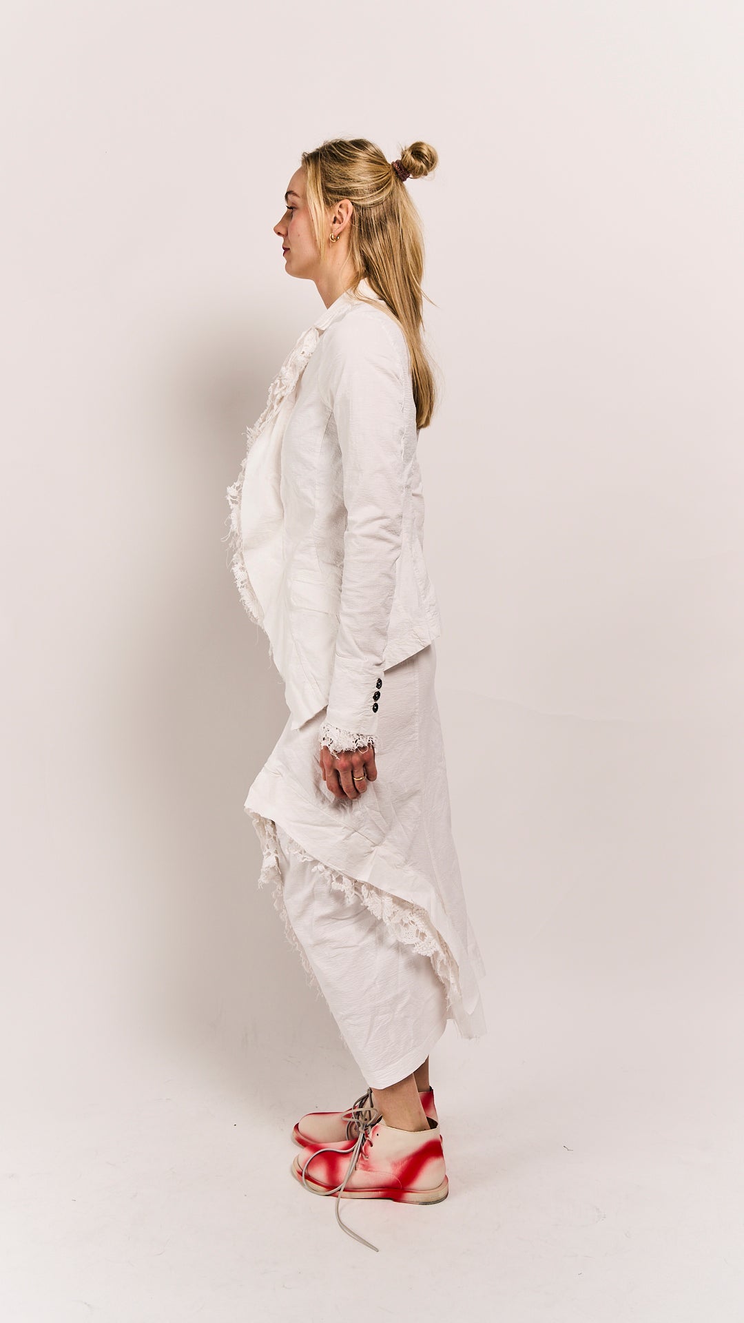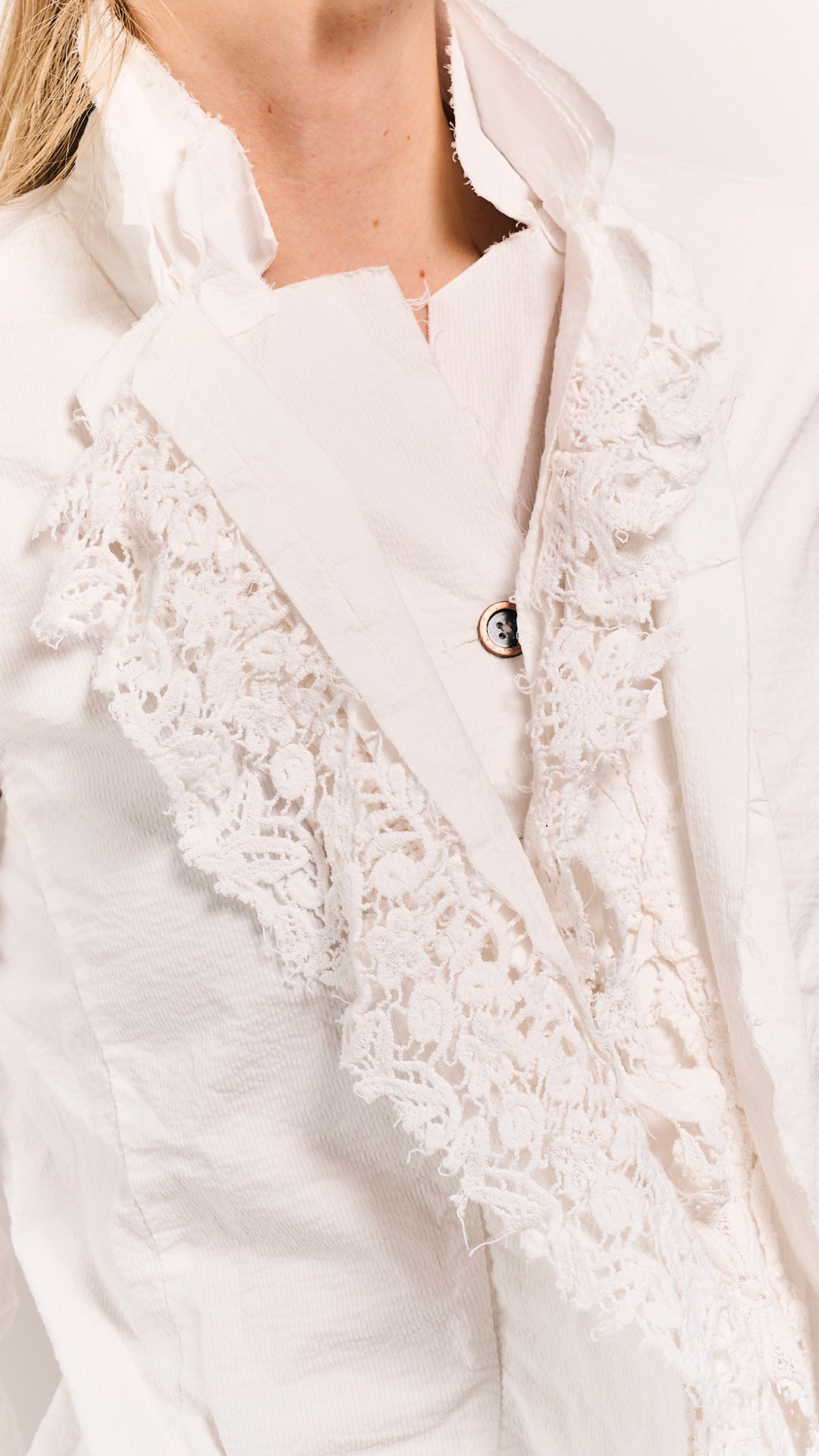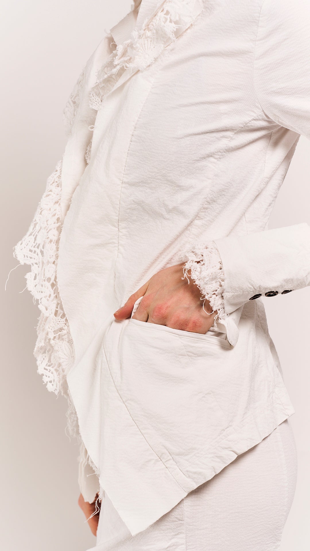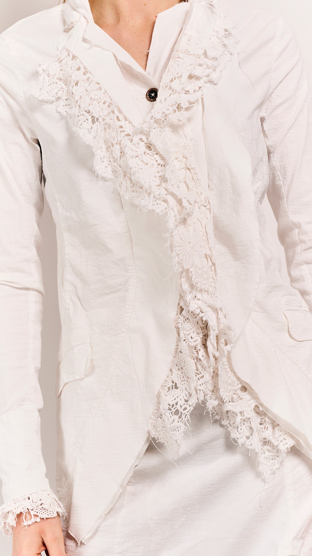 This body-fitted Rundholz DIP jacket proves that precision and playfulness aren't mutually exclusive. Lace inlays soften the jacket's architectural frame, creating visual intrigue without compromising its sharp tailoring. The seafoam fog colorway—moody yet luminous—works as a neutral that refuses to be boring. Perfect for layering over minimalist pieces or mixing with equally bold silhouettes.