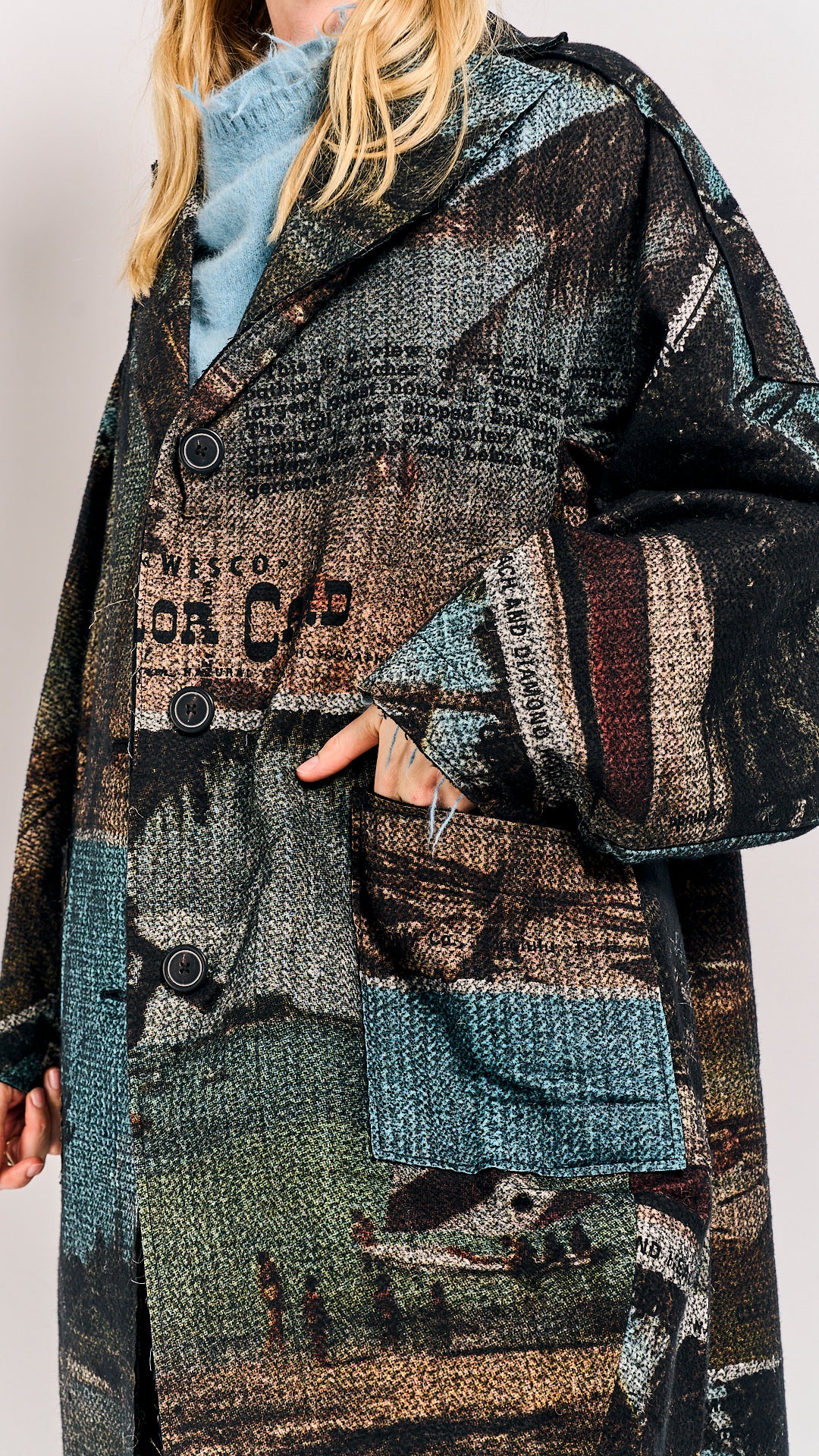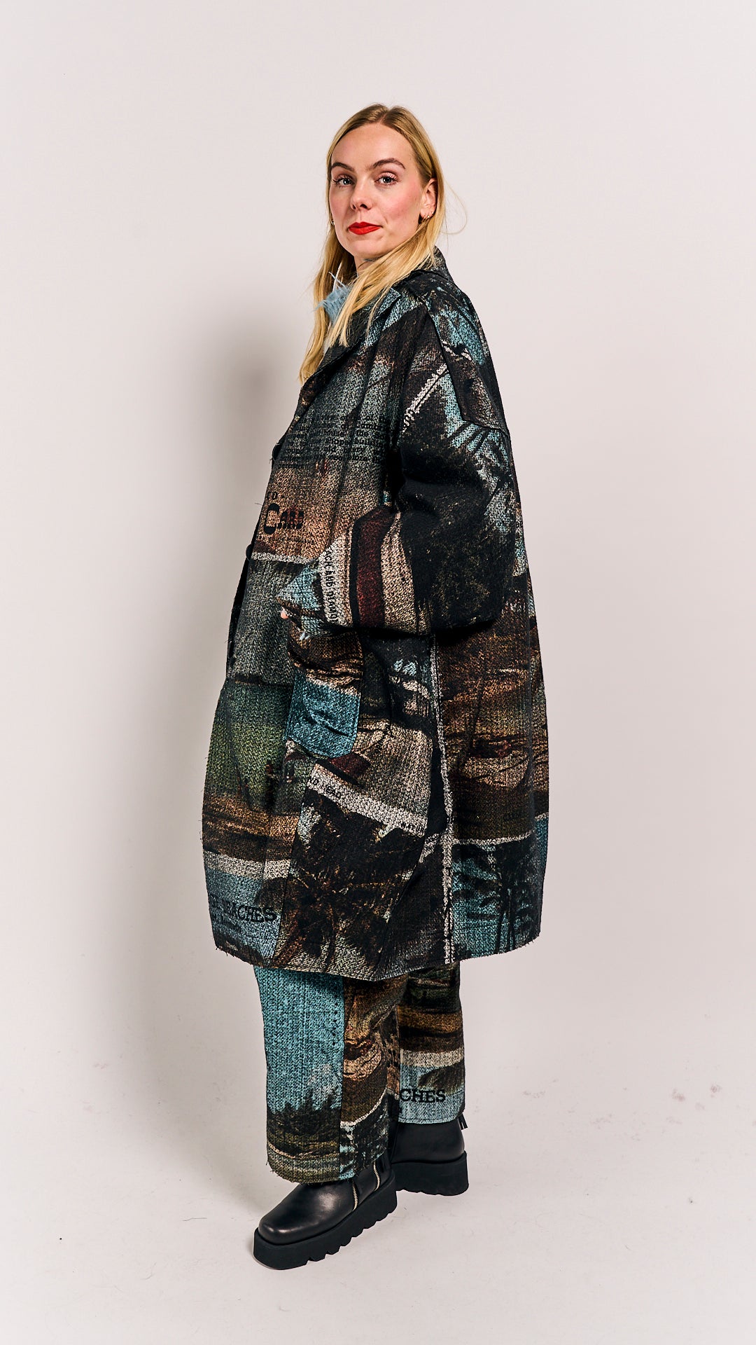 Stay cozy and stylish this winter with the oversized long coat featuring a fun Bermuda print. Made from 100% cotton, this warm coat by Rundholz DIP offers comfort and breathability while making a bold fashion statement. Perfect for chilly days when you want to wrap up in playful elegance.