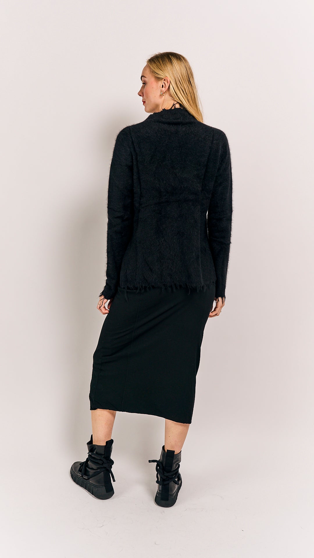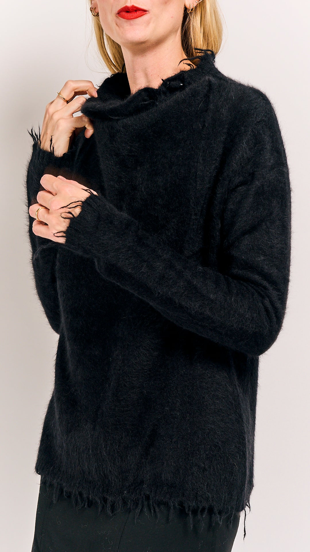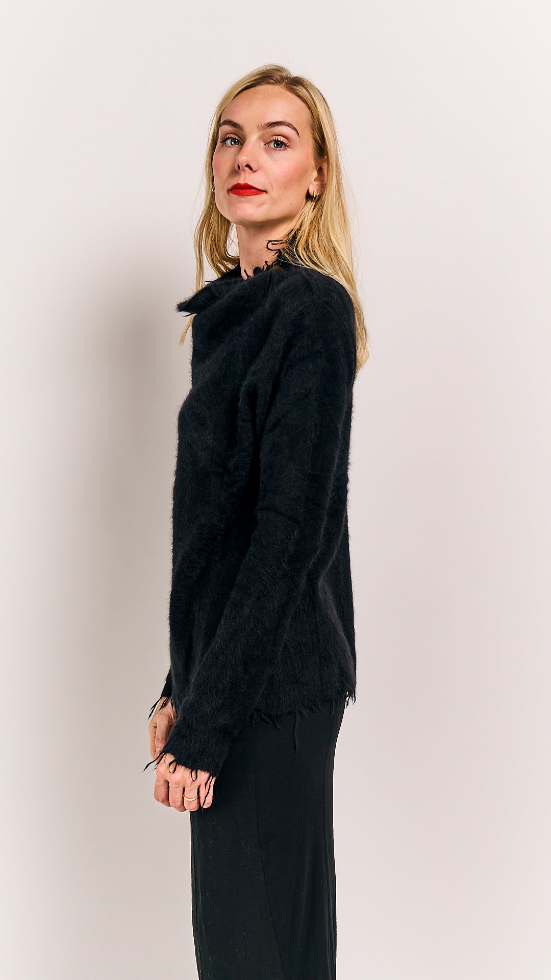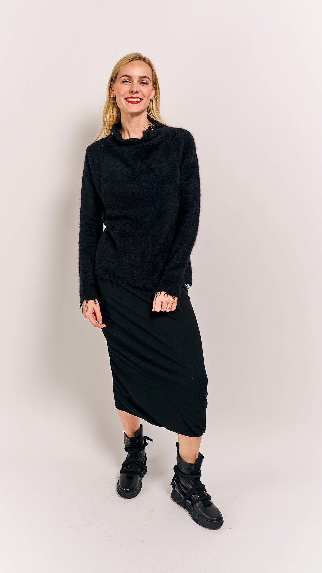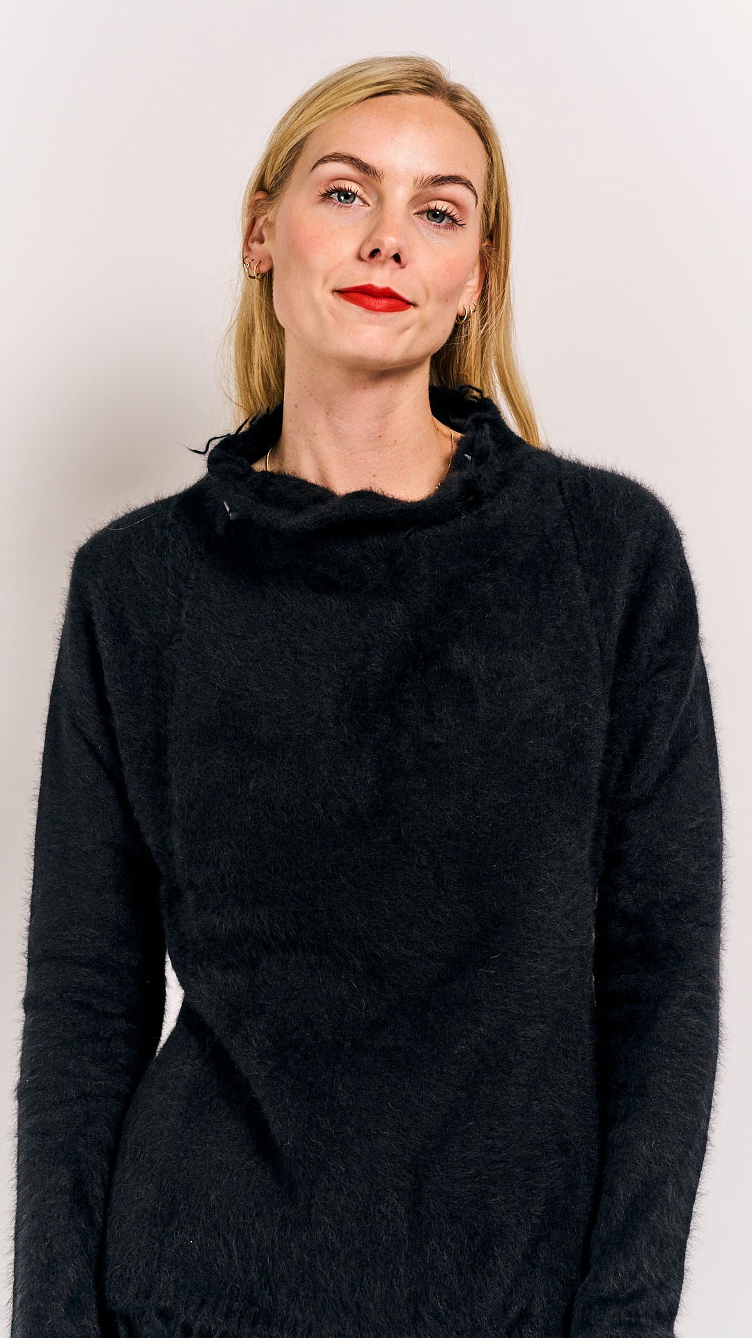 Wrap yourself in luxury with the Black pullover from Rundholz DIP. Crafted from a unique blend of soft fox fur and smooth silk, this sweater offers unmatched warmth and a silky touch. Fox, the new luxury fabric from Rundholz, offers a soft, plush feel similar to raccoon fur, bringing a fresh twist to cozy elegance.