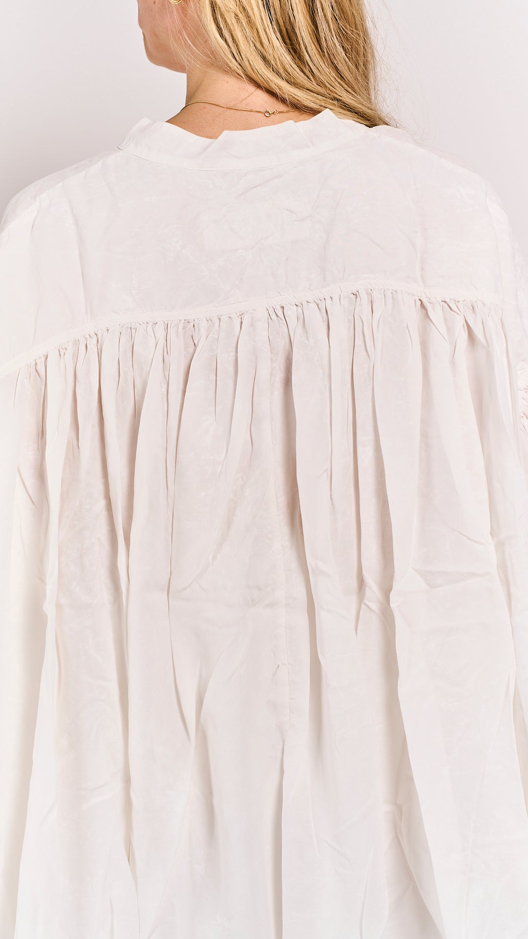 A Rundholz DIP essential in pure cupro—this sky fog blouse flows with architectural ease and whisper-soft luxury. The fabric's fluid drape and subtle luminescence make it endlessly versatile: wear it loose over basics, tuck it into tailored trousers, or layer it under oversized silhouettes. 100% cupro means breathable comfort and a gentle sheen that evolves throughout the day. Understated, refined, and impossibly easy to love.
