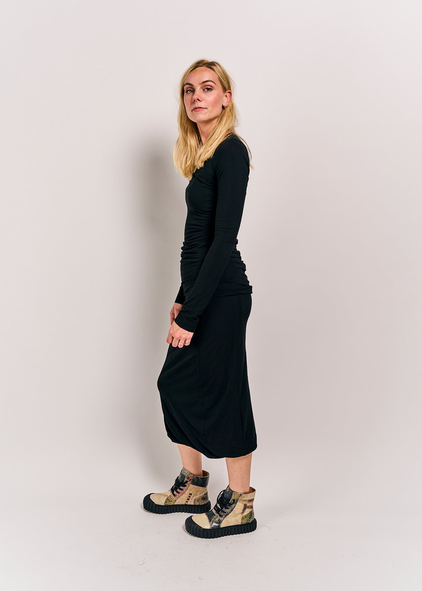 This classic skirt from Rundholz DIP combines the comfort of cotton with a touch of elastin for a perfect fit. Its timeless black design makes it a versatile addition to your wardrobe, effortlessly pairing with your favorite tops for a chic, fun look.