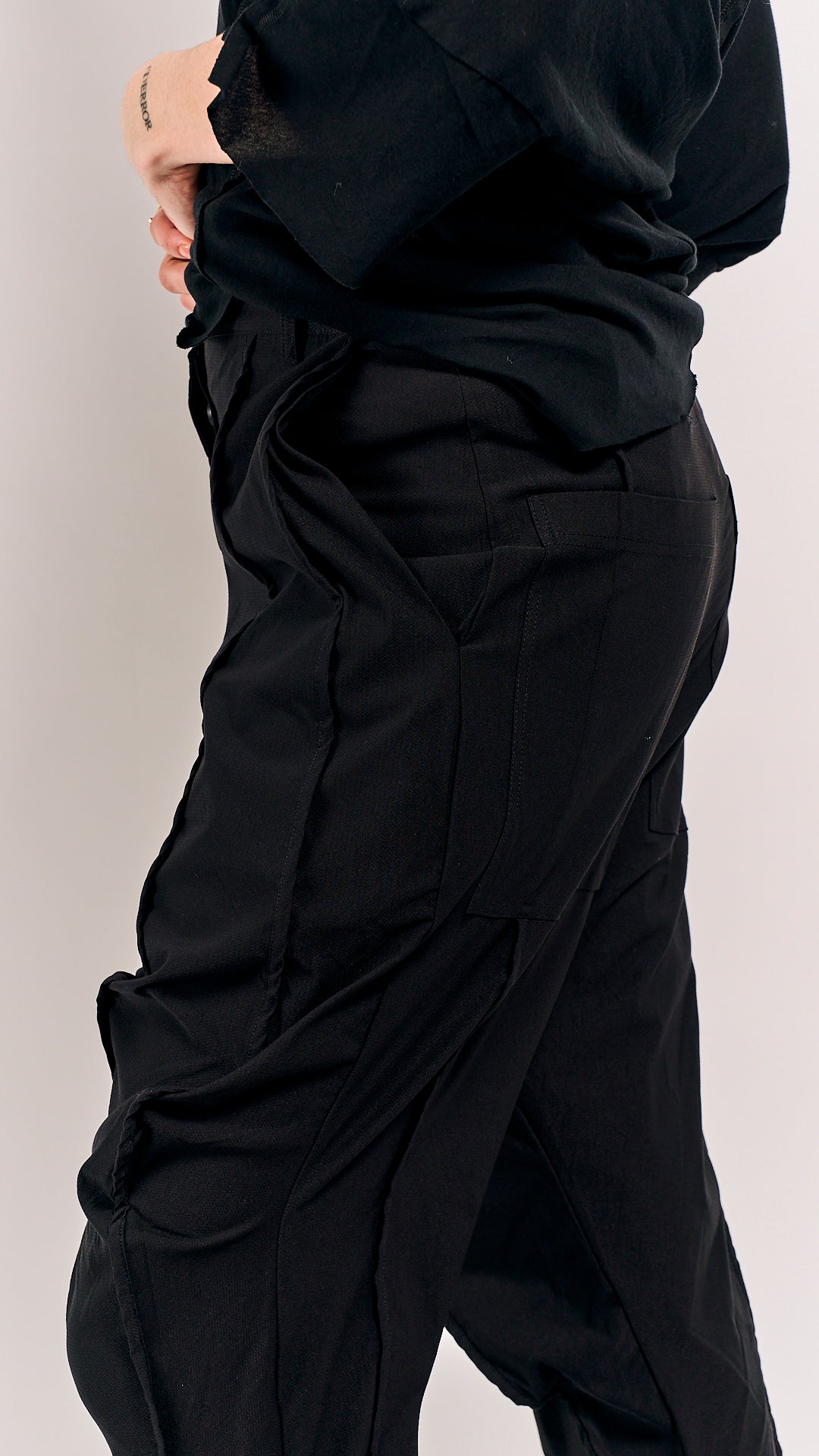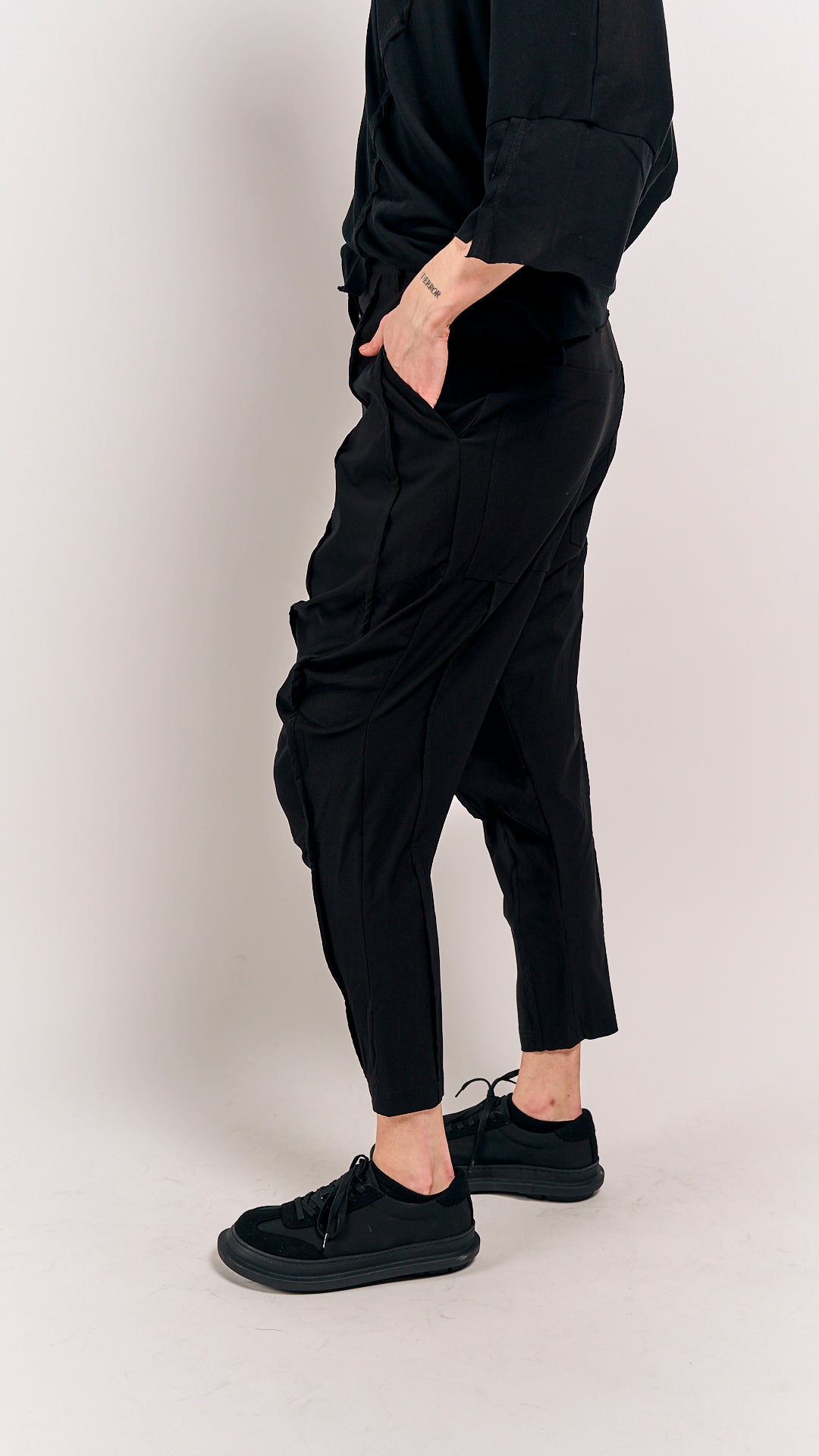 Rundholz Black Label's summer 2026 statement piece—trousers that dare to drop. The relaxed, lower-crotch silhouette cuts a deliberately unconventional line, perfect for those who treat fashion as creative rebellion. Rendered in classic black, they pair effortlessly with oversized tops or fitted layers for maximum editorial impact. A defining piece for the season that transforms your everyday wardrobe into something unmistakably bold.
