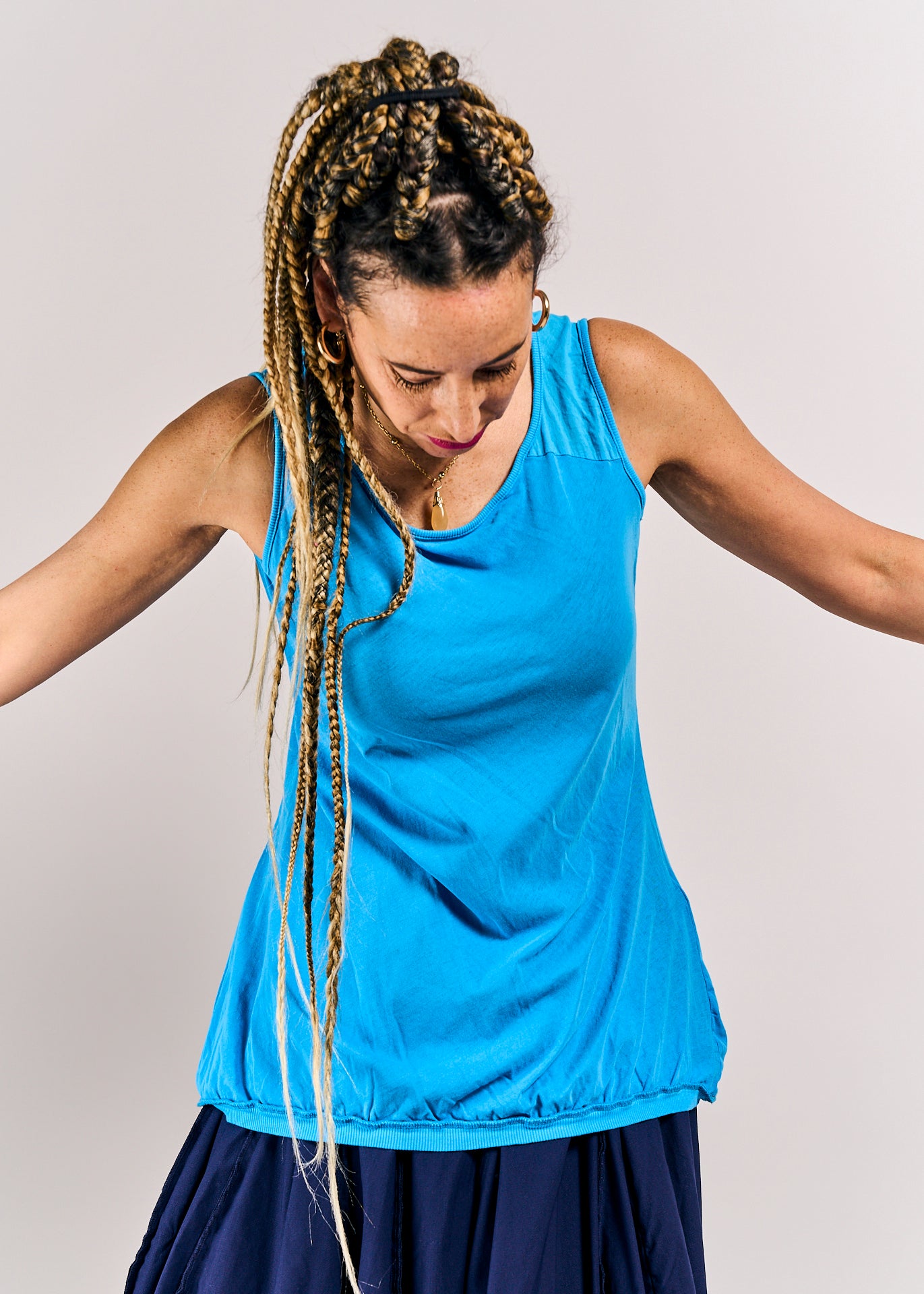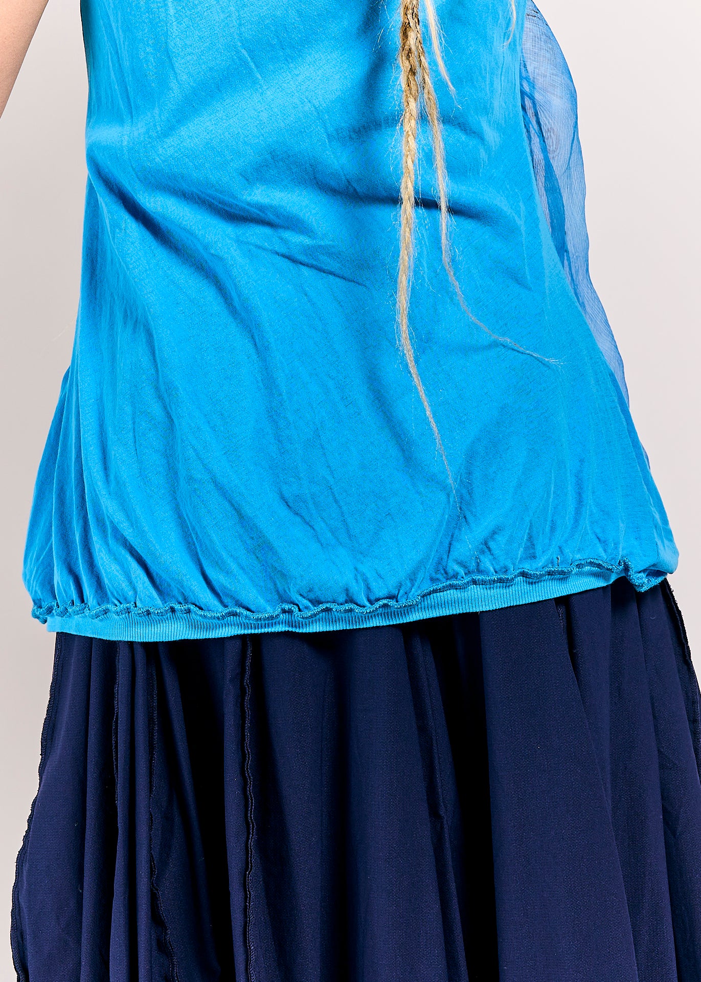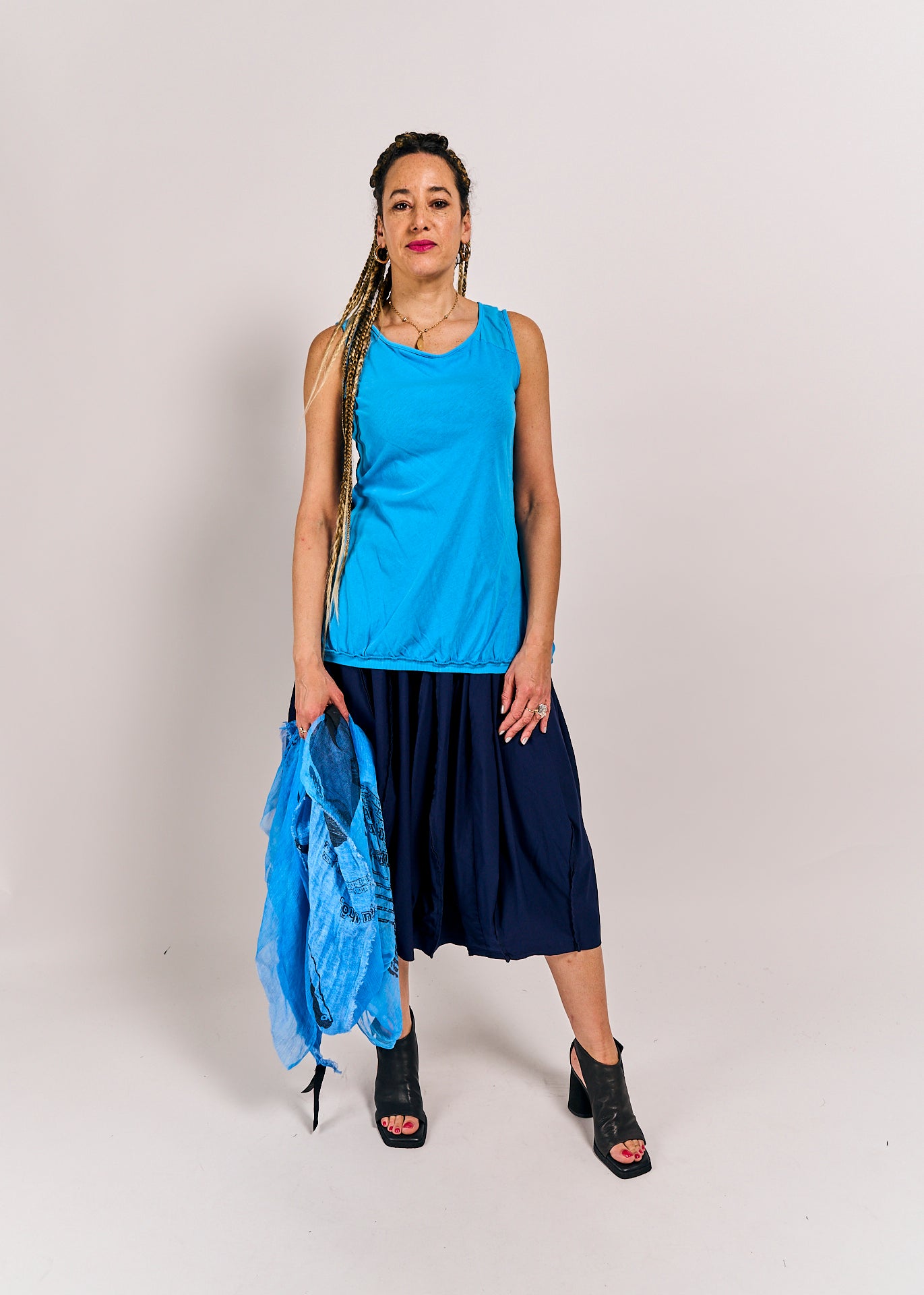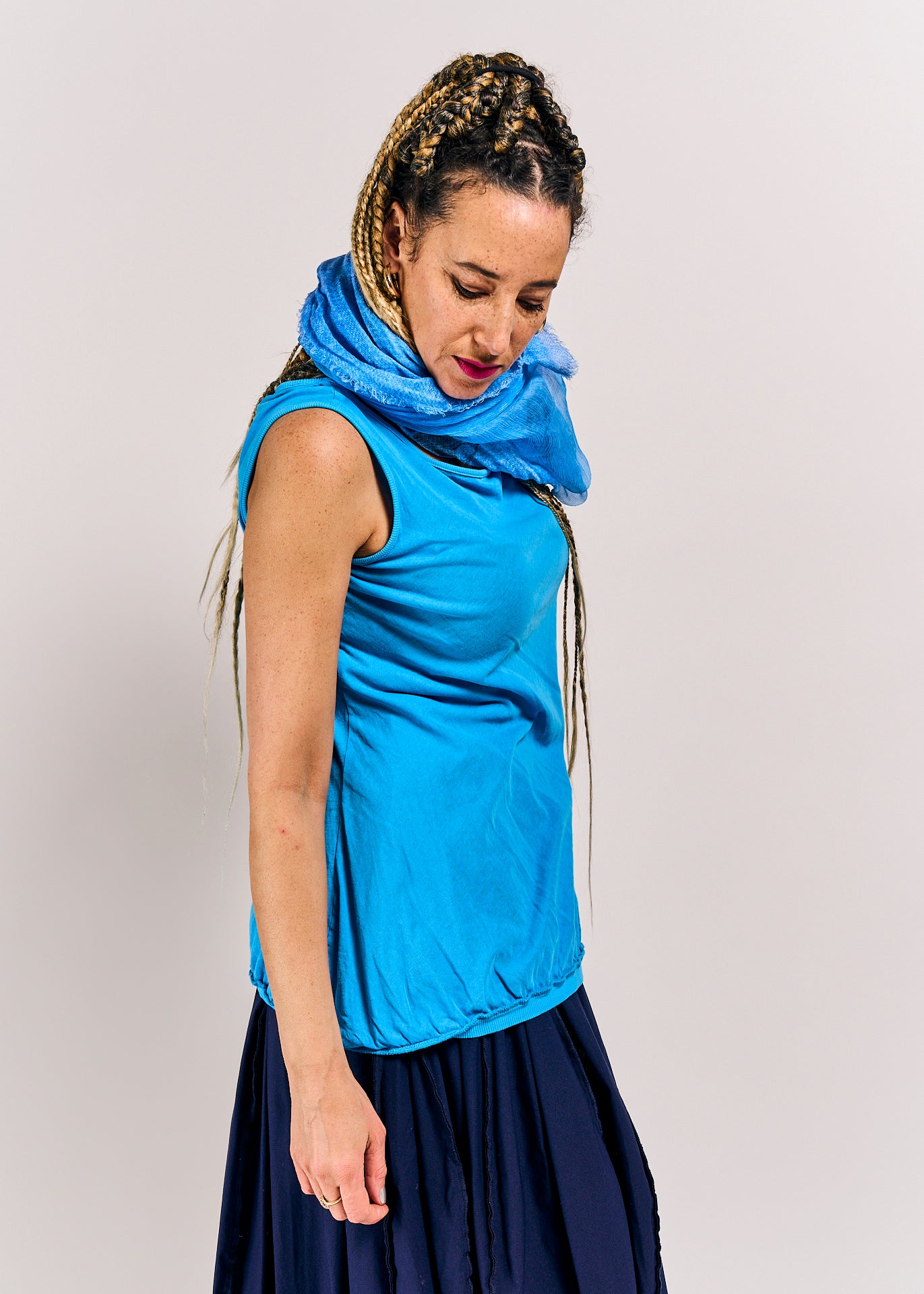 This playful navy top from Rundholz Black Label is the perfect addition to any wardrobe. Its loose fit and sleeveless design offer comfort and versatility, while the wider round neckline adds a unique touch. Perfect for those looking for a touch of quirkiness in their wardrobe!