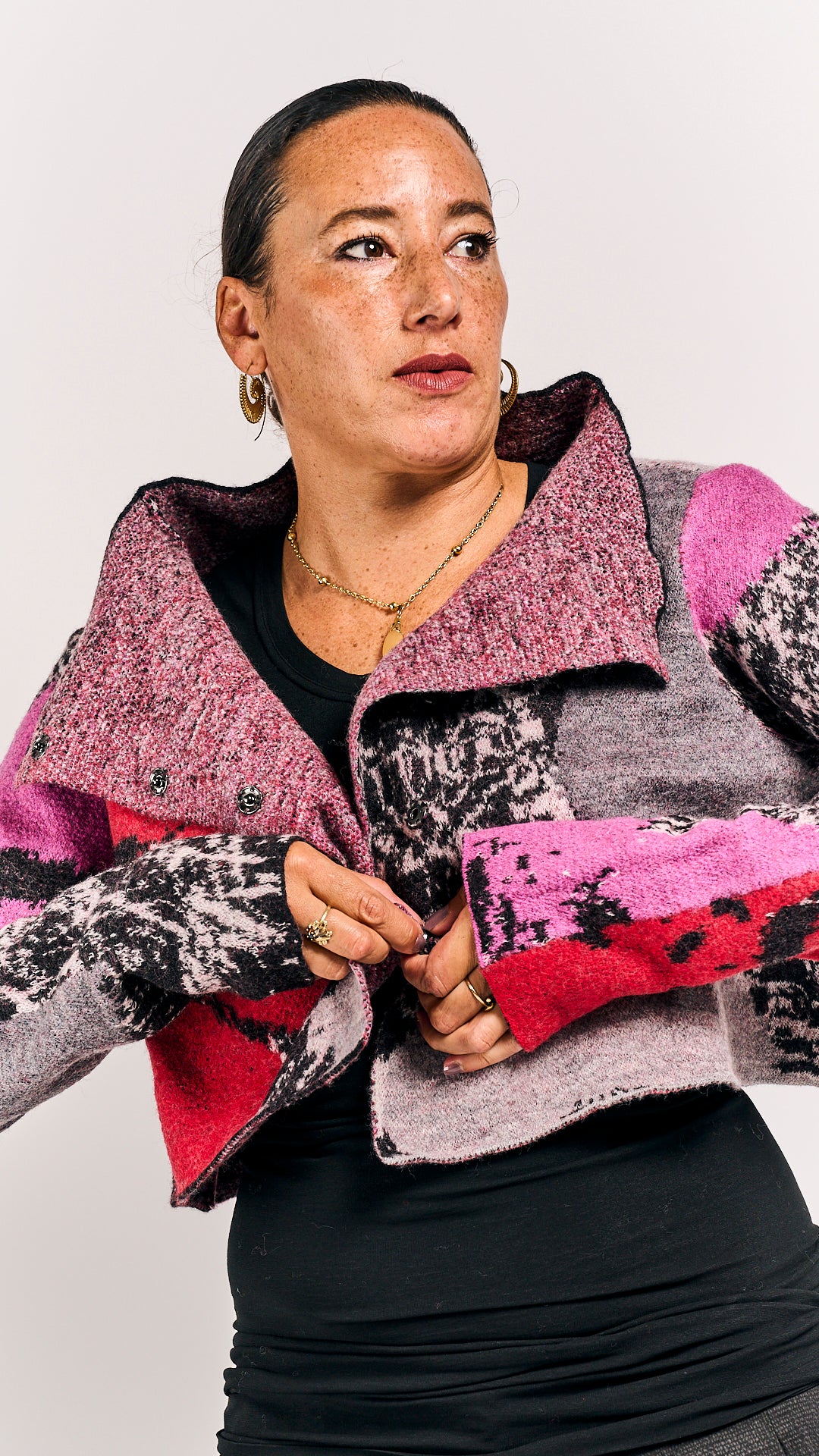 This playful short jacket from Rundholz Black Label is crafted from 100% wool and showcases all the colors of the season. Its vibrant multicolor design makes it a true statement piece, perfect for adding a fun and cozy twist to your wardrobe.