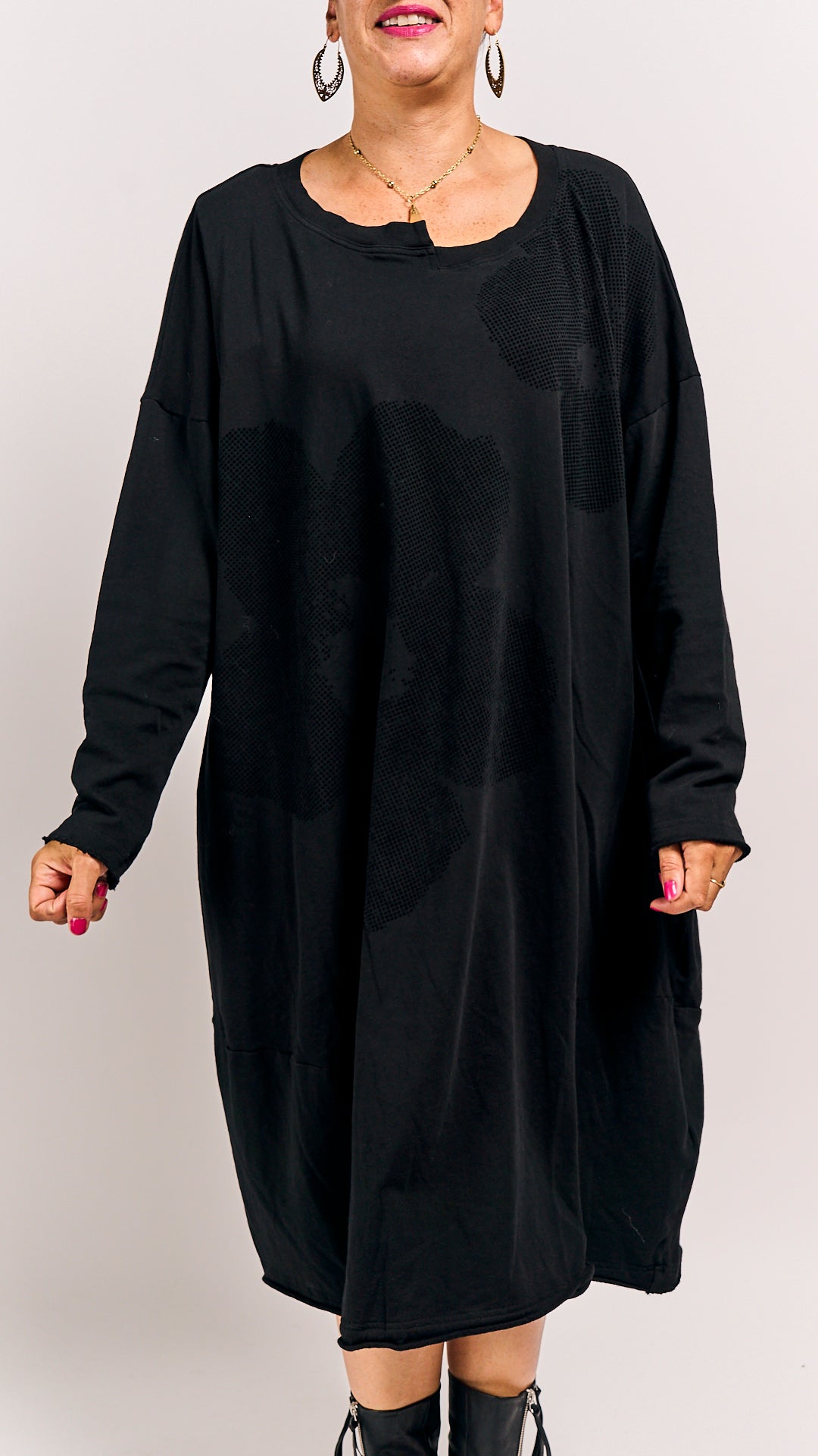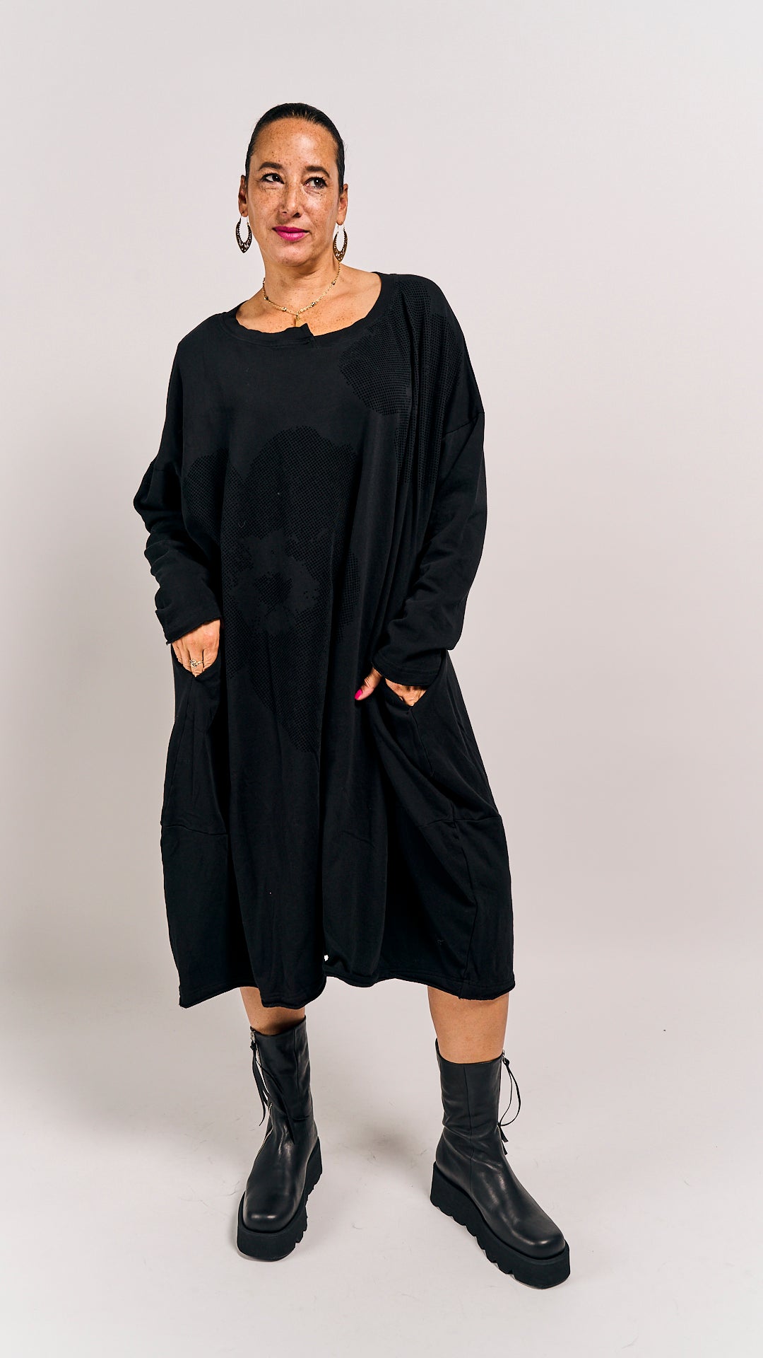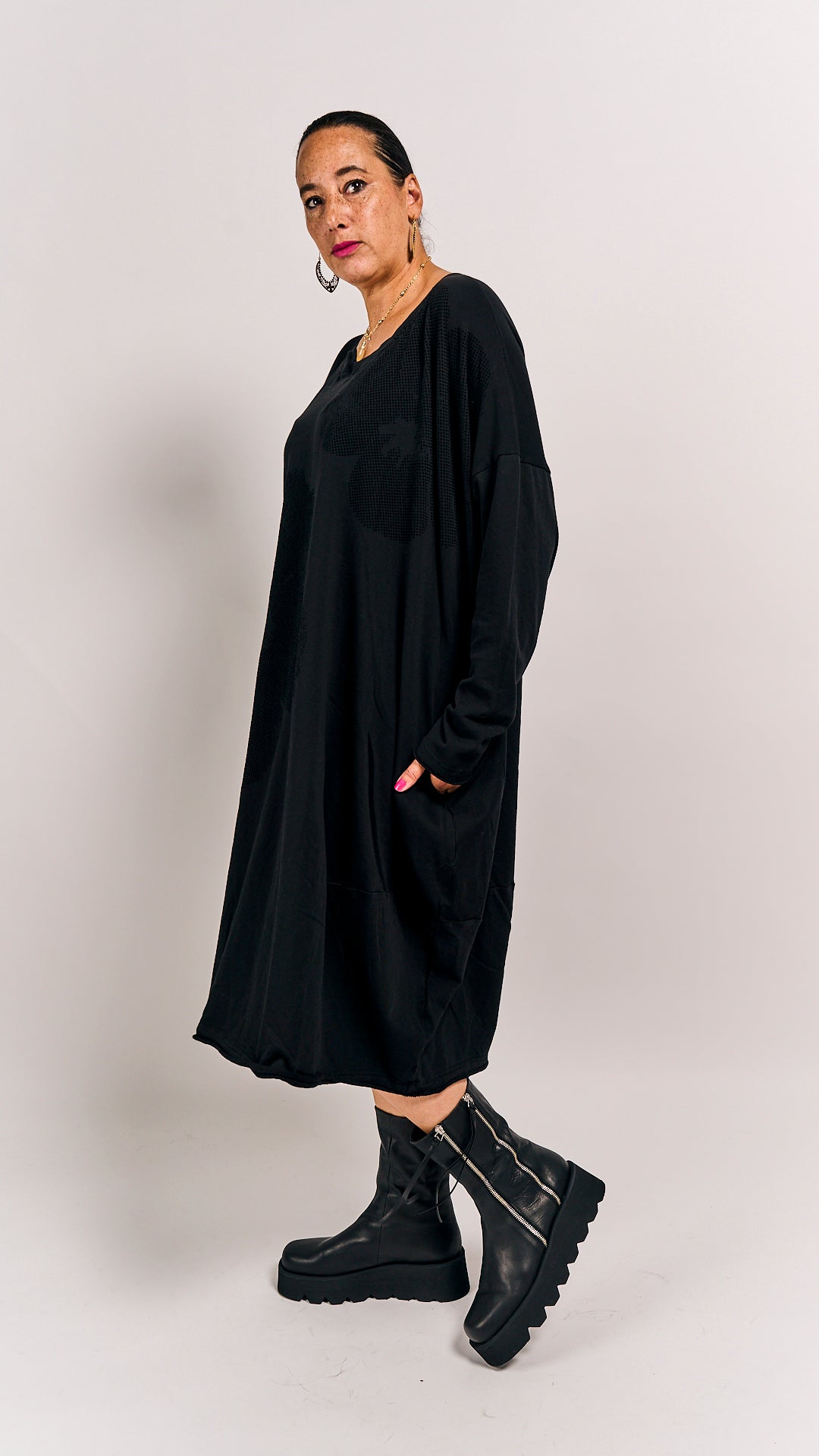 This oversized dress from Rundholz Black Label combines classic black cotton comfort with a playful printed twist. Its roomy fit lets you move freely while making a bold style statement. Perfect for those who love a mix of timeless and fun in their wardrobe!