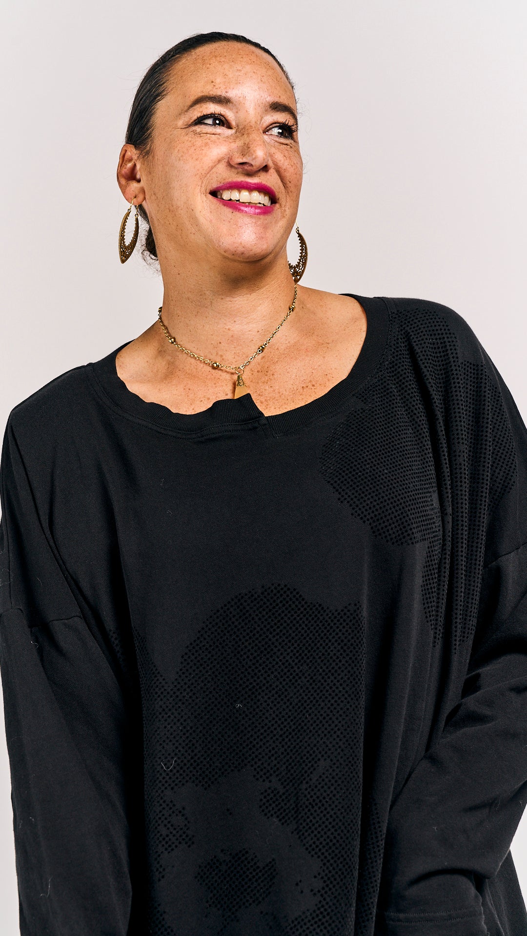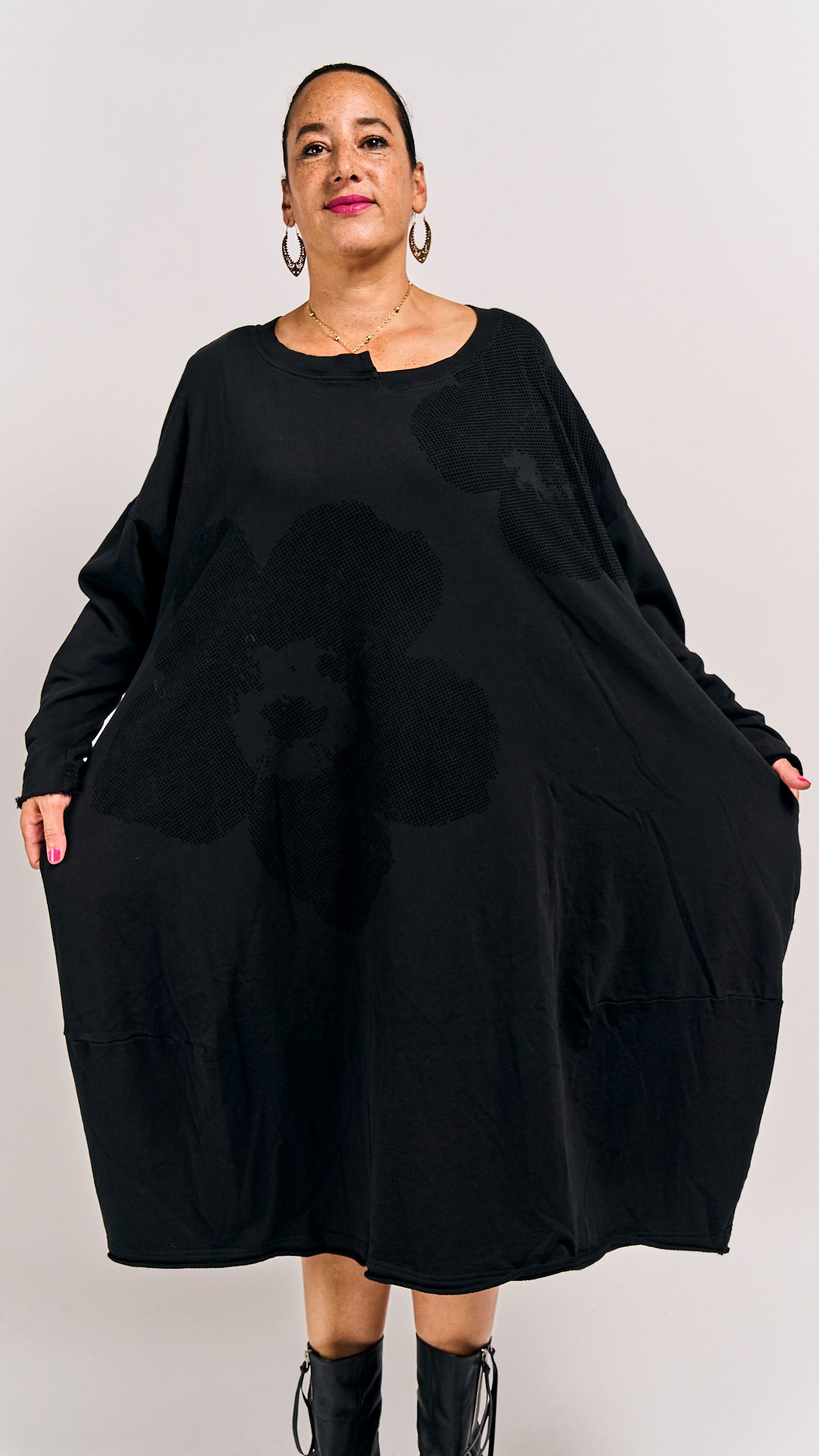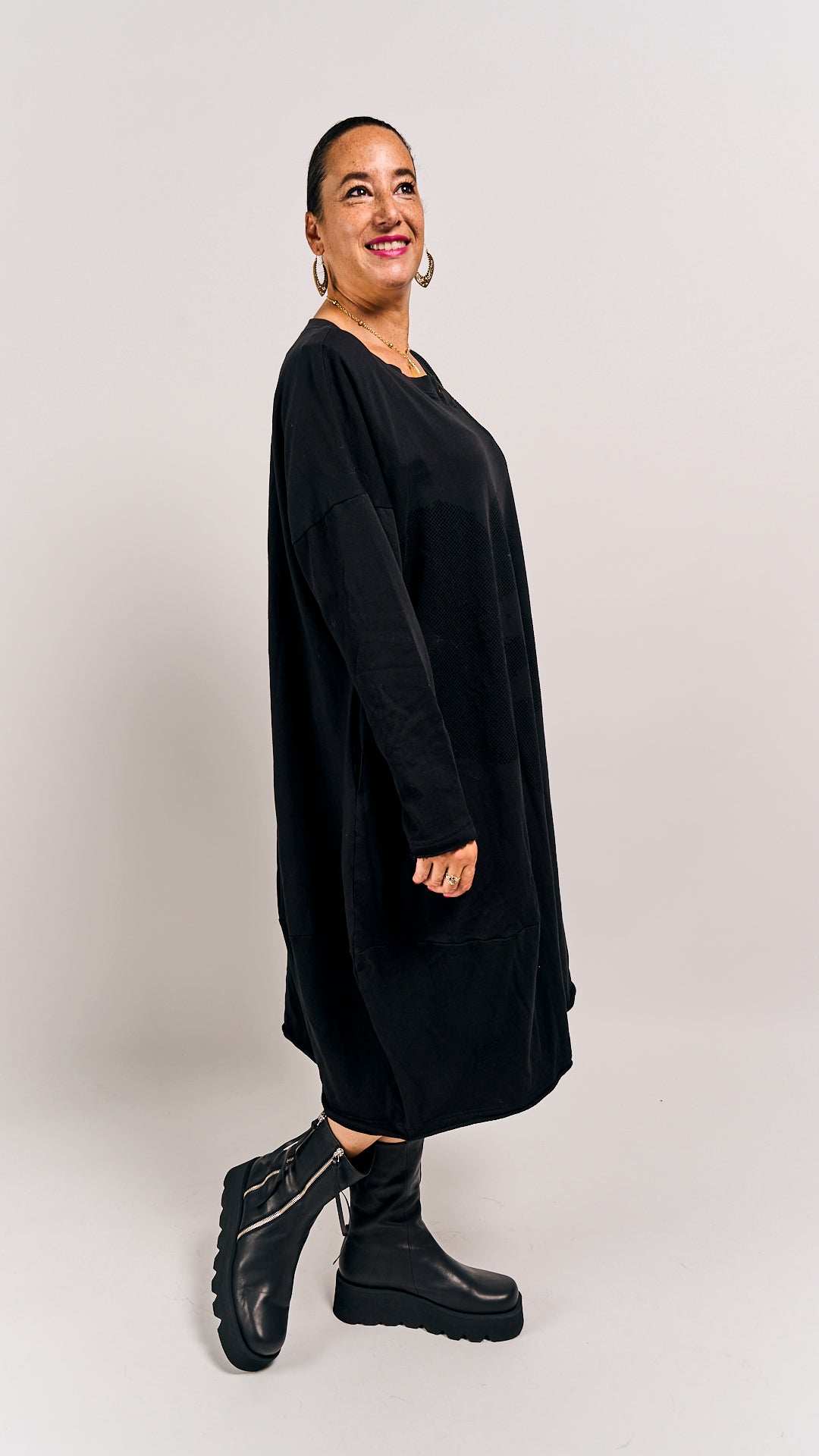 This oversized dress from Rundholz Black Label combines classic black cotton comfort with a playful printed twist. Its roomy fit lets you move freely while making a bold style statement. Perfect for those who love a mix of timeless and fun in their wardrobe!