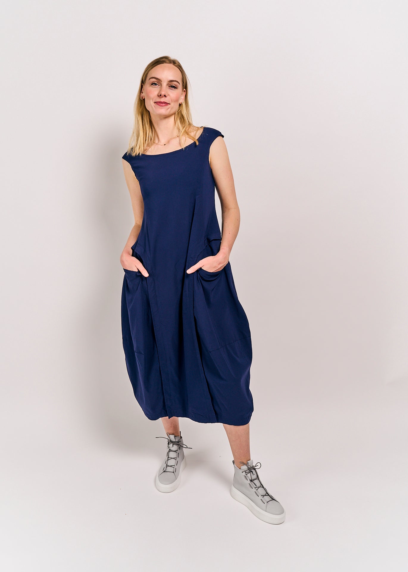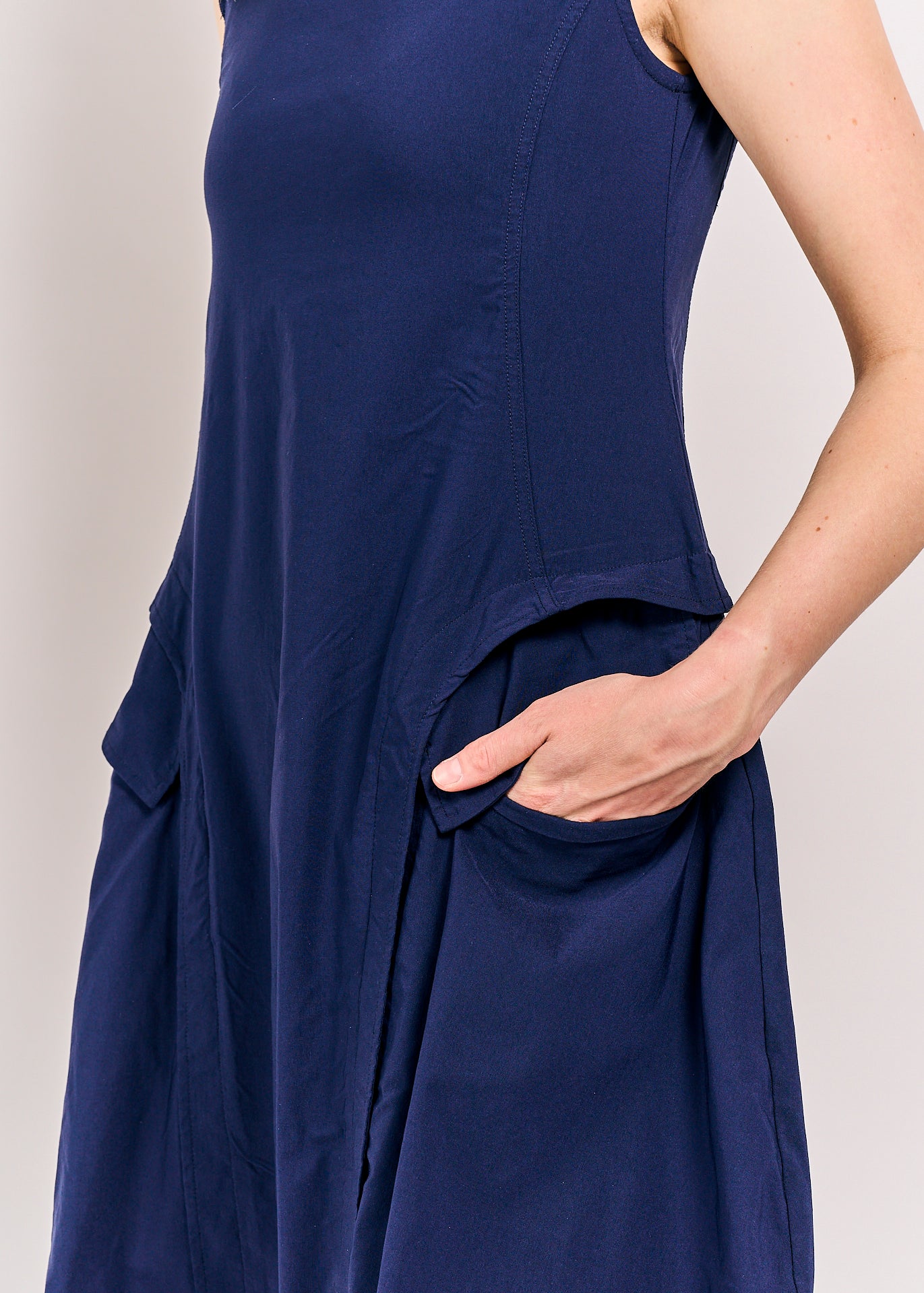 Stay chic and comfortable with this dress. Designed with a sleeveless and wider round neckline, this dress features big pockets at the front for added convenience. The fitting bodice and wide skirt create a flattering silhouette for any body type.