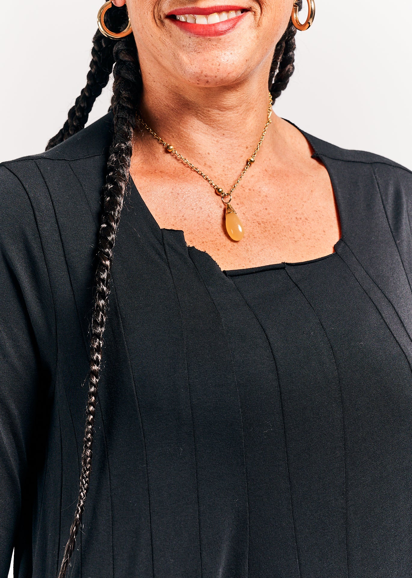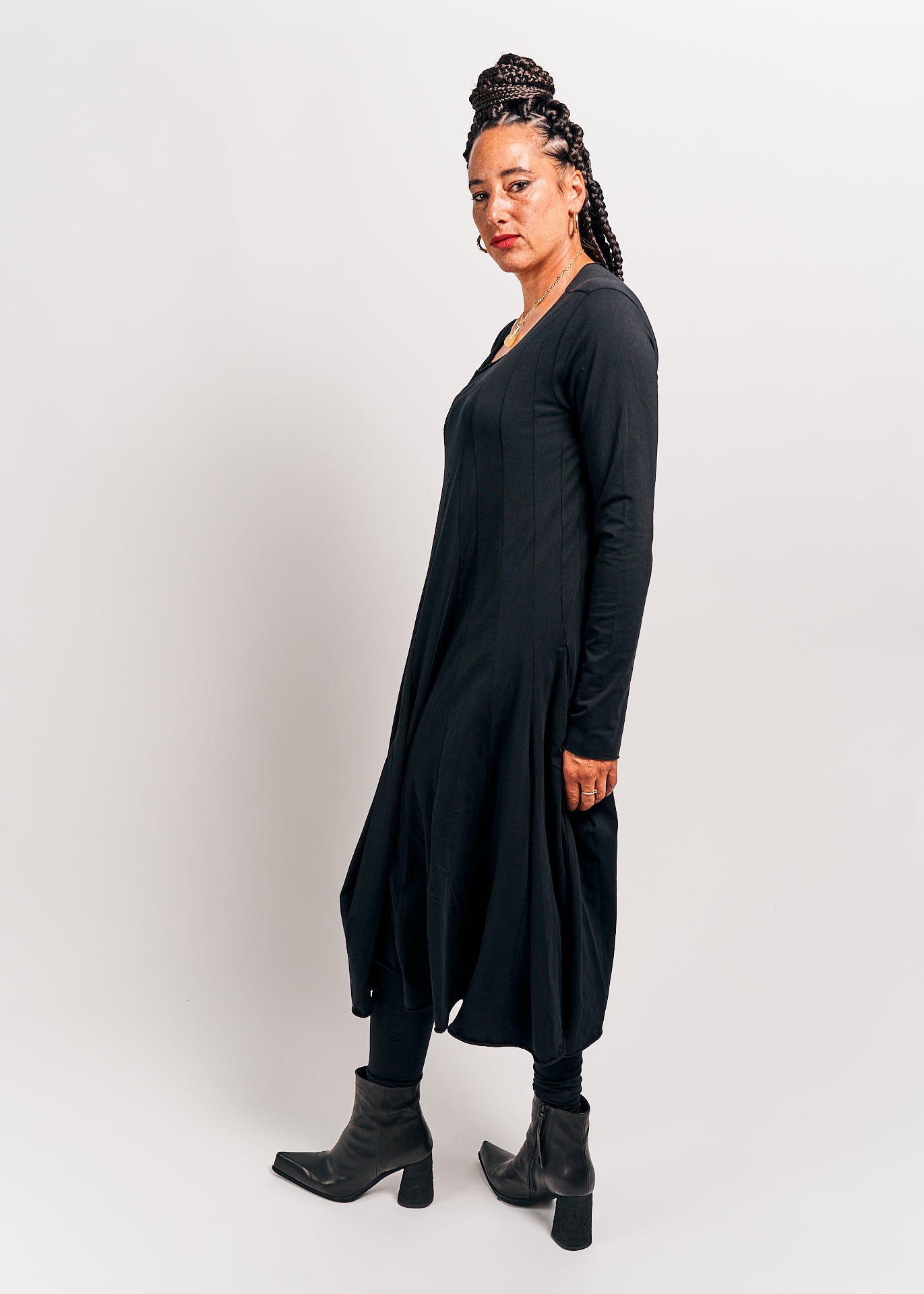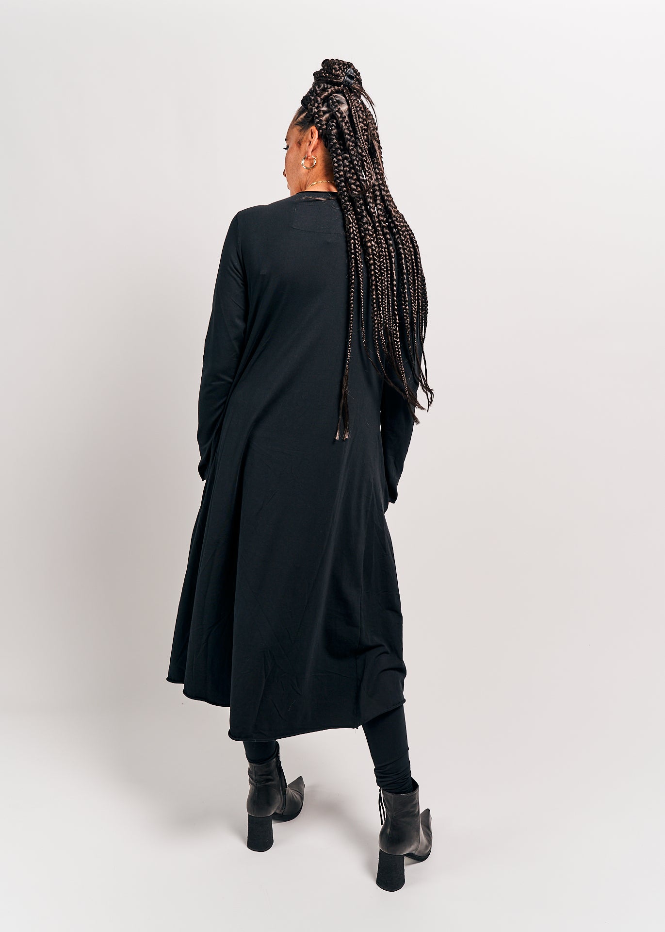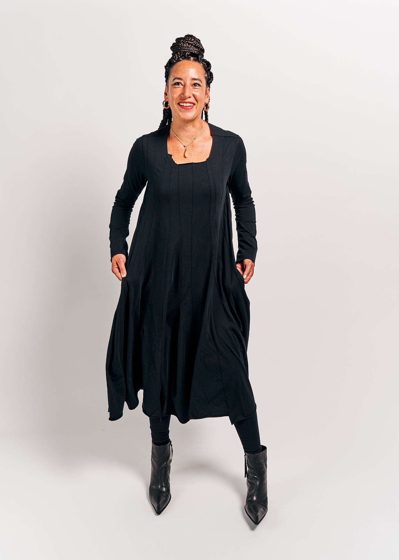 This longsleeved dress features a wide cut and detailed neckline. With its versatile design, it can be dressed up or down for any occasion. Experience comfort and style in this must-have addition to your wardrobe.