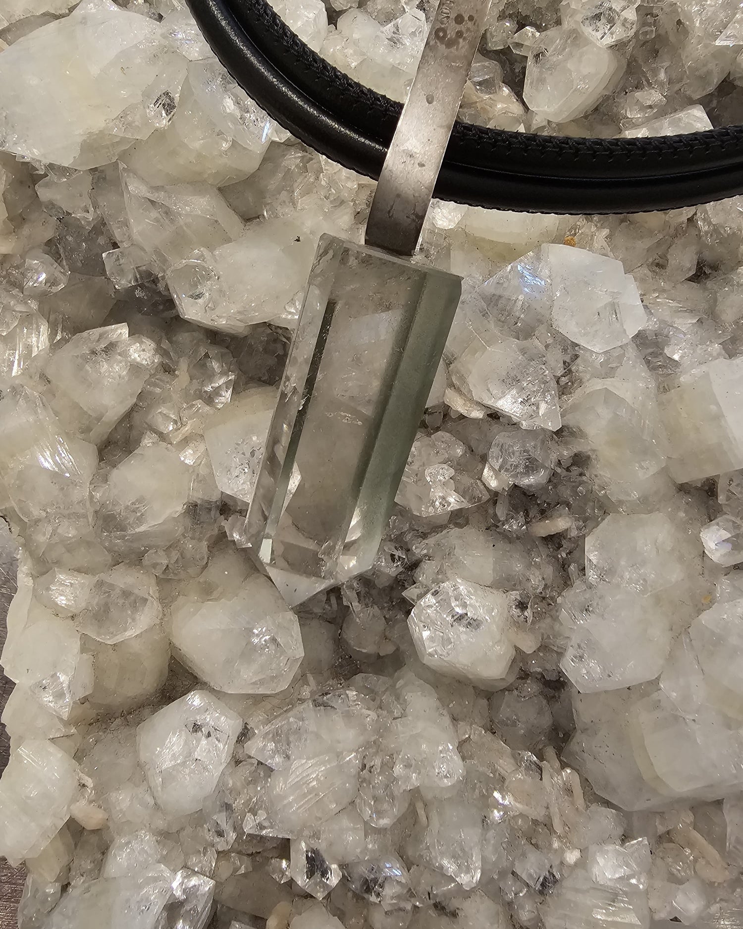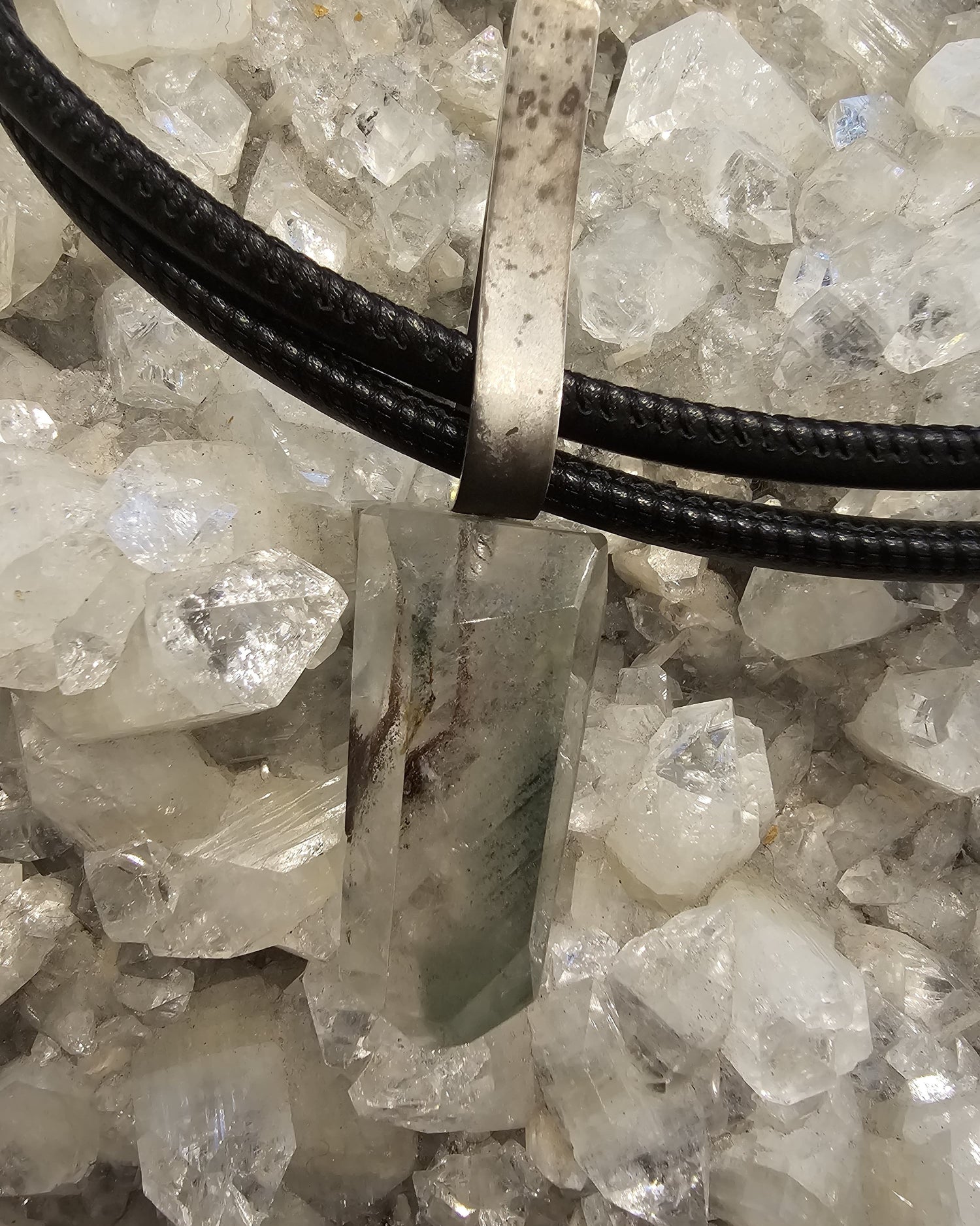 Clear rock crystal pendant with a silver fitting on two leather cords.