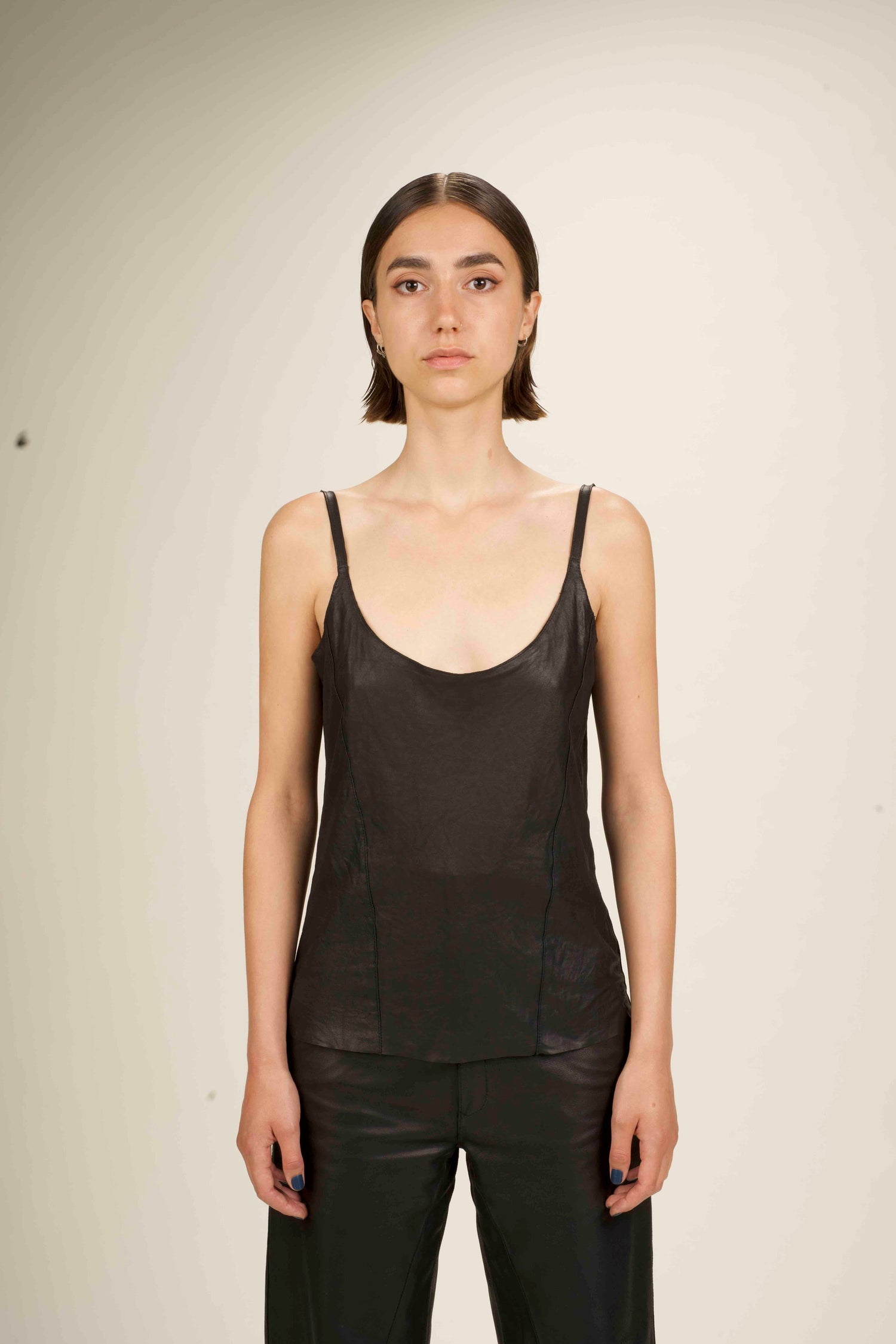 Introducing our Van Der Wilt Camisole in Chalk Crackle! Made with luxurious leather material, this sleeveless top adds a touch of edginess to any outfit. The low cut design is perfect for highlighting your favorite accessories. Rock the trendiest color of the season and be ahead of the game!